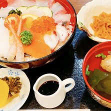 キッチンしまの海鮮丼、これにふぐのお吸い物・煮物小鉢付き。1050円☻
