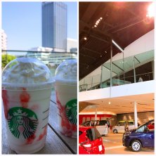 ❁ 日産本社におじゃま ❁ 今日は夫と のんびりお茶をしながら みなとみらいのokストアでお買い物 日産グローバル本社ギャラリーのスタバにて *ストロベリークリームフラペ 外のテラスで海?川?を見ながら飲んだら 暑くてもやっぱりまだ5月 カラダが冷えました okストアで デリバリーのピザ箱に入れられた 30センチピザを469円でゲット♬ レジ袋が有料なので 箱をむき出しに持ったまま(右の写真の) 日産グローバル本社ギャラリーを通る 不思議な光景ですが 横浜駅に繋がる通路です