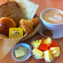 バリ島7日目の朝ご飯♪ フルーツ、パン、カフェラテ バリでの休日も明日でお終い。(T_T) 今日は最後の田んぼハイキングへ行って来ます♫