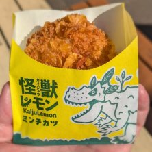「怪獣レモン メンチカツ」 チキンとキャベツのメンチカツでレモン果汁が入っていて、衣にコーンが入っています。 衣のザクザク感が怪獣みたいなので、怪獣レモンメンチカツなんだそうです。 一口食べると衣がサクッとして、その後レモンの風味が広がります。 怪獣という割には優しい味です。 美味しくいただきました。