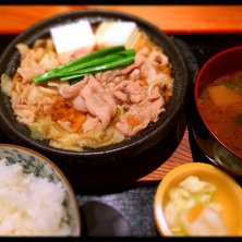【天草豚の煮込み定食】 豚、キャベツ、もやし、にら、豆腐の醤油ベース。 柚子胡椒が効いてて美味しかったです^_^ 630円だし。