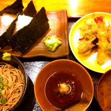 【おむすびと天ぷらセット】 鮭とタラコの大きめおにぎり2つに、天ぷらとミニ蕎麦も付いててお得にお腹いっぱいです(^。^)