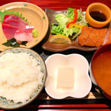 ランチは吉祥寺「魚猿」にてお刺身と豚ひれカツ定食を頂きました。メインはもちろんのこと、豆腐とお米がとても美味しかったですよ☆