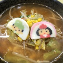 五右衛門ならぬ六右衛門ラーメン750円 辛いけどサッパリしてるスープに釜石ラーメン系の細麺です スープが粉っぽさを残してて 本来のスッキリした味に届いてない感じかな?お父さんの味に追いつくのはもう少し時間がかかりそうですね お雛様蒲鉾はご愛敬ですね