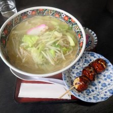 中山町にある「しんぼり食堂」の麻婆ラーメン@ 'ェ' @ちょい辛で美味しかった!たこ焼き三つついてくるよ。