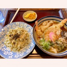 ランチは『武蔵茶屋本店』さんでうどん 二天定食 二天うどんに高菜飯 現金払いでした 二天うどんは海老天、餅、しいたけ、野菜天の 入ったうどんになります 麺は平べったいです