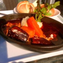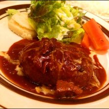 ハンバーグステーキ。 肉肉しい粗挽きのハンバーグにビーフシチューがかかってます。 ちょっとお高めですが美味しくいただきました。