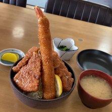 我山噴火丼2800円 大海老1本、ロースカツ200g、ヒレカツ2枚で構成されるオールスター勢に500gの大盛ライスが下支えする超ド級どんぶりメニュー。上品な味わいの甘口ソースで🦐🐖🍚どれも美味だけどボリューム的には致死量であります☠️