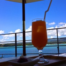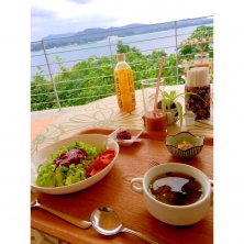 古宇利島のカフェであぐーランチ(*˙˘˙*) 海の見えるテラスでいただきました♡ でも明日の沖縄は雨…ダイビングどうしよう~~(´- ̯-`)