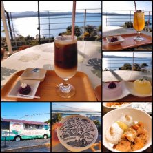 古宇利島に移動✨ 上段→Cafe t&c とうらく 美しい海を眺めることが出来るカフェ 冬でも本当に暑い💦ということで 紅芋🍨&シークァーサー🍨 姪っ子は梅ジュース🧃 私はアイスカフェラテ🥤 ここは海外の方いなくて静かでゆっくりと過ごせました🤗 下段は→KOURI SHRIMP🦐 可愛いワゴン車が目印😙 3階建てで屋上で美しい海を楽しみながら食べることも☝️ こちらは欧米のお客様が多くて一気に海外に旅行来た気分♥ 今回はテイクアウトしてホテルで🍴 とても美味しかった〜😙