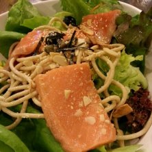 サーモンパスタサラダ。カリカリに焼いたニンニクが、美味しさの秘訣かな。