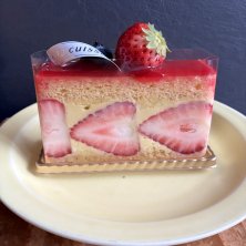 おやつフレジエ〜 ほわっとしょっかんの生地、なめらかなピスタチオのムースリーヌはやや柔らかめ、トップはいちごソース 口の中に入れた時の一体感が心地よい!