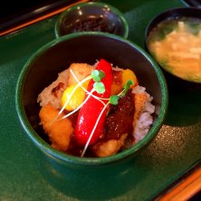 ひしお丼とお味噌汁ときくらげの佃煮 初めて耳にする名前の丼物だったので注文。どうやら小豆島のご当地グルメのようです(⌒▽⌒) アジのフライにパプリカ、ソースがちょっぴり独特で、醤油麹かな? 初めて食べる味だったけど、美味しく頂きました〜(^O^)
