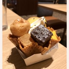 晩御飯ブュッフェのデザート 『秋の大収穫』と名付けられたワッフルコーンカップのソフトクリーム❤️ さつまいもの甘露煮、かぼちゃソース、栗のシロップをかけてくれました。プチシューと蕨餅とチョコレートブラウニーは自分でトッピング。 豪華なパフェになりました。 このパフェもおかわり自由…😅 でも、2個は食べれないよね お腹いっぱい ご馳走様でした。