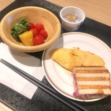 本日の朝ご飯ブュッフェ ミニトマト、さつまいもの甘露煮、オクラとほうれん草のお浸し ライブキッチンで作ってくれるチーズオムレツ 紫キャベツとハムのホットサンド 4分の1切れ 美人の素 今日も朝からとても穏やかなお天気☀️ 久しぶりのホットサンド、美味しかった😋 今日も頑張ろう!行って来ます