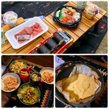 今日は、娘と一泊二日のキャンプです 少し遅めのお昼ご飯は近くのスーパーで お腹が空いていたので設営前にテーブルだけ出して昼食 今晩のキャンプ飯は サラダ トマトとベーコンの炊き込みご飯 ポトフ デザートのスイートポテト なかなかの出来