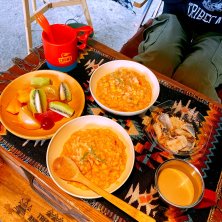 今朝のキャンプ飯 昨日の残りのご飯をリゾット トマトクリームリゾット フルーツ盛り合わせ ニシンの甘酢
