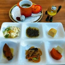 朝食ビュッフェ🌄 すき焼き風煮物うずら卵添え🐂🧅🥚 だし巻き卵🐣 高野豆腐の煮物🥕 もずく酢 切り干し大根の煮物🥕🍄🟫 手作り豆腐 鯖の煮付🐟