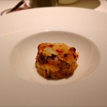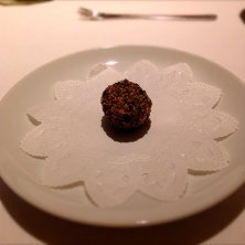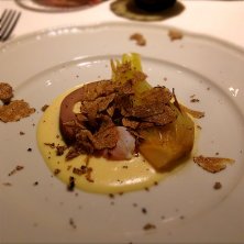 アミューズは、ラズベリージャムを詰めたフォアグラ、トリュフ仕立て。周りにトリュフとナッツがまぶしてあります。