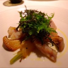 クエの低温コンフィ、アワビ茸、カブのサラダ仕立て。 神楽坂の名店。本日はピエモンテスペシャル!