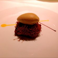 ドルチェ。チョコレートのテリーヌと栗のジェラート。 間に、カダイフで、栗のからの見立て。 この後、食後酒をいろいろ…。