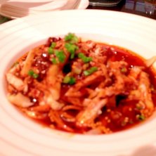 棒棒鶏 日本の棒々鶏イメージを全く裏切るこの真っ赤な見た目。予想通りに激辛。ゴマは何処に?というくらい存在感なし