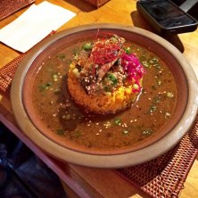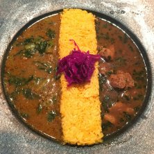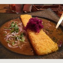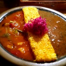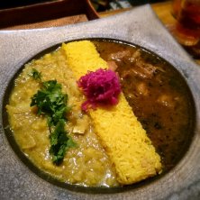 本日のカレー サンマとナス。スパイシーで複雑な味、サラッとしていて飽きがこないと思います 具材でルーも変わるらしいのでまた違うのも食べてみたい、定番のチキンカレーとの相盛りもおいしそうでした。盛り付けも丁寧。ほんとに狭いお店だけど人気なのも納得