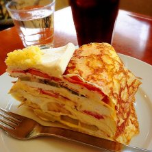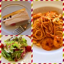 パスタランチ♪ 海老の辛口パスタ マロンミルフィーユケーキ サラダ&オレンジアイスティー