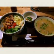 ランチパスポート活用! 鳥肉とマリネした野菜たっぷりの丼ものに具沢山味噌汁、お漬物付き(¥860→¥540) 穴子で有名な玉井の姉妹店らしい。夜がメインのお店でランチはこのセット一品のみ。 おいしかった♡また行こう