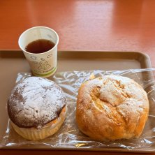 とろーりチーズドーナツと今日までの期間限定販売の苫小牧総合経済高校の生徒さんと共同開発したメロンパンにハスカップクリームが挟まったハスカップサンドしちゃいました!に無料🆓サービスの紅茶😋