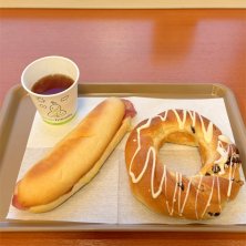 ドライブ中のもぐもぐタイムはどっちも今月のおすすめ商品の枝豆ハムパンとクルミキャラメルデニッシュに無料サービスのコーヒー😋