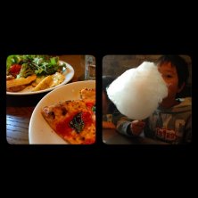 娘が勝手に自分の髪を切ってしまい急遽美容院へΣ( ̄[] ̄;) 帰りにクオモで遅めのランチ。 ビュッフェのデザートの綿飴に感激の息子。店員の可愛いお姉さんと一緒に作って更に満足気♪(´ε` )