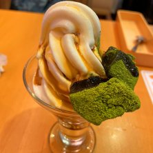 デザートにソフトクリーム(抹茶わらびもち) ソフトクリームの下にはコーンフレークが… その上に黒蜜がかかっていて抹茶わらびもちは ほんのり苦い 笑 でも、美味しい♫ たまにはいいかな〜😜