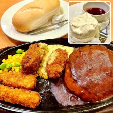チーズインハンバーグ&カキフライ 自家製タルタルソース ソフトフランスパン 豆乳レアチーズケーキ ラズベリーソース ファミレス定番的なハンバーグですが、ふっくら仕上げでチーズはトロトロ。カキフライは付け合わせのハッシュドポテトより小さめなのは、ファミレスならではのご愛嬌で、気にしない気にしない。(タルタルもカキフライの下) でも、共に衣サクサクで味ともに満足。豆乳レアチーズはガーゼがかけられ、しっとりさを保持。値段の割には、ボリューム満点。 Disney Seaの帰りに、妻と遅めの晩ご飯。