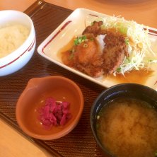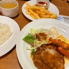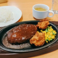 お昼ごはーん(*´∇`*) ハンバーグデミグラスソース&若鶏の唐揚げランチ(火曜日の日替わりランチ) いただく(๑˃̵ᴗ˂̵)