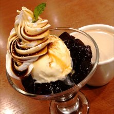 道端のお店でお仕事。うーん、進まんなあ。甘いもん食べてまた集中。
