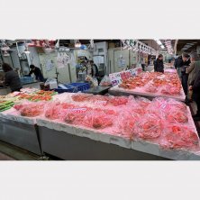 この時期の境港はカニで真っ赤です。 買ったカニをテーブルで食べられます。