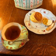 プレーンスコーンと デカフェのマスカットの紅茶🫖 久しぶりのMorrisさん 去年のクリスマス期間の応募に外れたしね🥲 正しい製法で淹れた紅茶は本当においしい😋