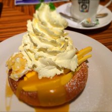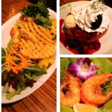 ガーリックシュリンプ、ペペロンチーノコンボ、ストロベリーチーズケーキパンケーキ