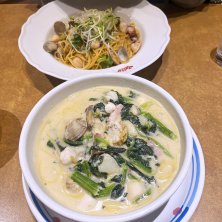 奥:海の幸のバター醤油 手前:ホタテとあさりのチャウダースープパスタ
