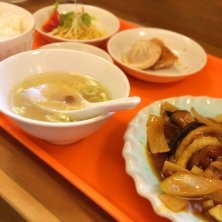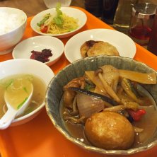 しのあで「骨付き鶏となすのサンラー煮込みセット」をいただきました 骨付き鶏とナスはサンラータンがしみ込んでいてご飯が進みます 他にも、スープ、小皿、サラダ、香の物と盛りだくさん いろんな味を楽しめました