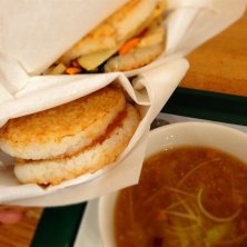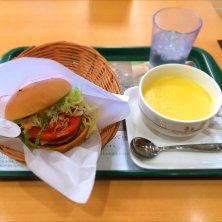 2日続けてのモスバーガー。今日は寒いのでコーンスープと野菜バーガー。 レタスの散らかり具合が…w (^^;