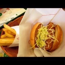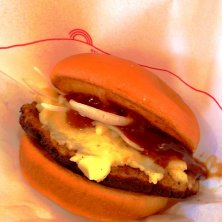 期間限定 辛味噌チキンバーガー。覚悟して食べたけど、全然辛くないぞォ〜(((ʘ ʘ;)))