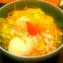 出張で仕方なく和食さとへ。炭水化物とタンパク質と野菜に注意してチョイスしたのが、野菜サラダうどん。栄養士さんに計算してもらったら、私の場合の炭水化物の量はうどん一玉でギリギリOKだそう。蕎麦や中華麺はアウトです。