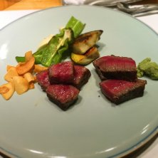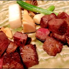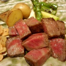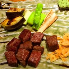 極上神戸牛コースで、サーロインとシャトーブリアンの食べ比べ! 右がシャトーブリアン、左がサーロインです。 つけ合わせの万願寺とうがらし、京ナス、安曇野わさび、ガーリックフライもめちゃんこ美味しくて、脂ののった肉によく合いました。 もう他のステーキでは満足できない美味しさでした