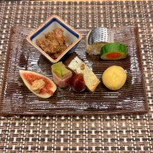 栗きんとん、秋刀魚柔らか煮、茗荷酢、山クラゲ生ハム巻き、イチヂク胡麻味噌、イカのとも和え、コハダ寿司、胡瓜明太子射込み