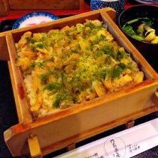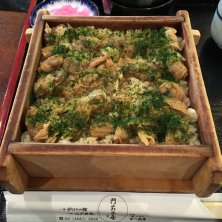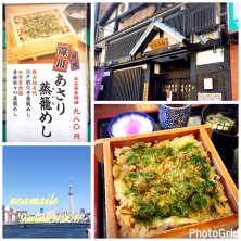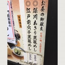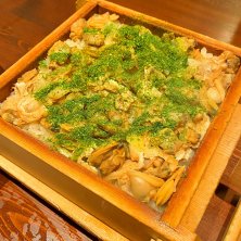 東京都江東区 門前仲町駅の付近に有る居酒屋の店、門前茶屋の深川あさり蒸籠めし。 アサリのエキスが入った御飯の上にたっぷりのアサリを入れ、日本料理の伝統的な技法である炊き合わせを駆使し蒸籠で蒸し上げ、最後に青海苔を加えて仕上げたこの店の看板メニューかつ1番人気メニューであります。 先代の板長が考案した創業当時からのメニューで、深川めしをより美味しくお客さまに食べてもらいたいという思いから作られました。アサリの旨味とふっくらとした御飯が良く合って美味しかったです。また蒸された香りが堪りませんでした。
