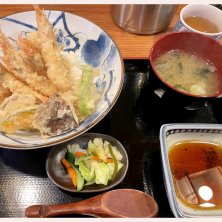 9月4日金沢旅行 2日目のランチ 割烹むら井で限定10食の甘エビ天丼 甘エビが7尾ものってました スゴく大きくて、おいしい甘エビ~♪ カボチャ、さつまいも、茄子などの 野菜天にお味噌汁、お新香付で¥1000 スゴいボリュームでしたが、サック サクの天ぷらで完食~♪
