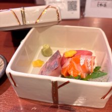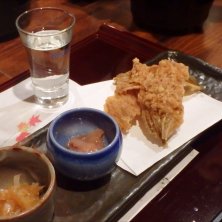 留肴の酒の肴三種盛りと吟醸生酒 冷酒。最初にでてきそうなものが最後のほうに出てくるこの個性(笑) 私は好きです(^^)