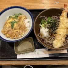 今日のランチは出先のちょっと先の駅まで行っての、天おろし蕎麦と玉子丼の定食を。 お腹ぺこぺこだったので一気に掻き込みました〜。 あ〜満足満足😋